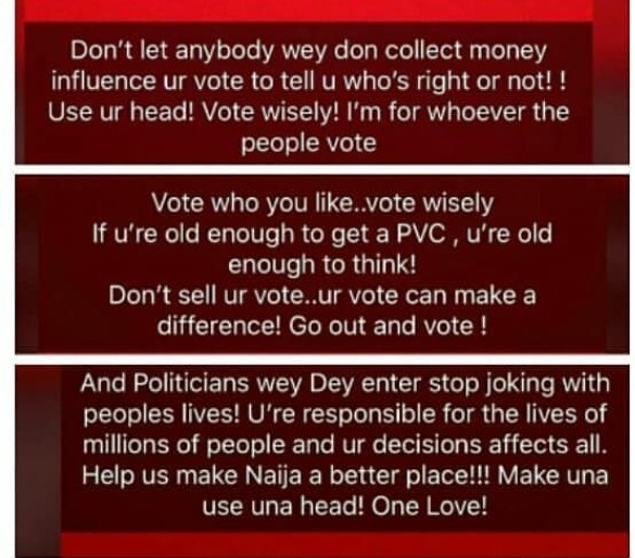 “Don’t let anybody wen don collect money influence ur vote to tell u who’s right or not! Use yot head! Vote wisely! I’m for whoever the people vote. Vote who you like…vote wisely. If u ’re old enough to get a PVC, u’re old enough to think! Don’t sell ur vote…uir vote can make a difference! Go out and vote!
