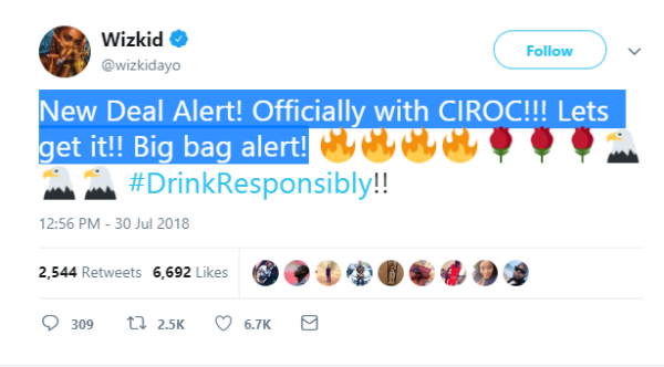 He made the announcement in a series of tweets where he said; New Deal Alert! Officially with CIROC!!! Lets get it!! Big bag alert!