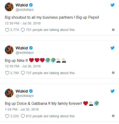 After the announcement, Wizkid also gave a shoutout to other brands he has deal with like; Pepsi, Nike, Dolce and Gabbana.