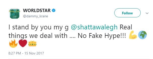 Dammy Krane said: “I stand by you my g @shattawalegh Real things we deal with …. No Fake Hype!!!”