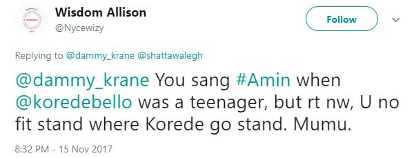 Continuining, a pissed off Wizkid’s fan wrote at Dammy Krane, He said; “@ dammy_krane You sang #Amin when @ koredebello was a teenager, but rt nw, U no fit stand where Korede go stand. Mumu”.