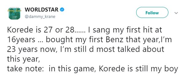 “Korede is 27 or 28. I sang my first hit at 16years, bought my first Benz that year,I’m 23 years now, I’m still d most talked about this year, take note: in this game, Korede is still my boy”.