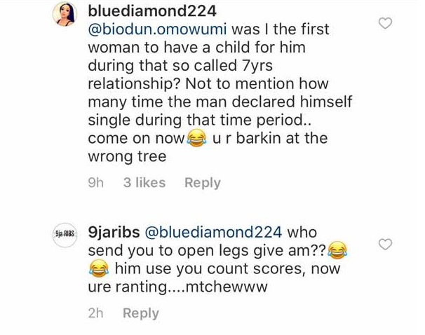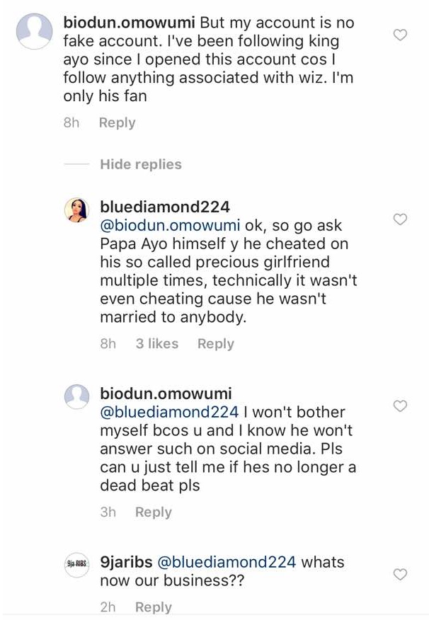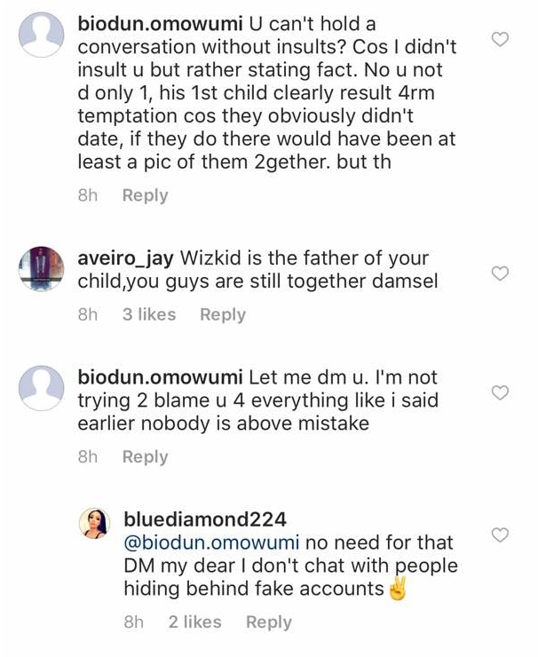 A die-hard fan of Wizkid, Omowumi caught the sub for wizkid and responded thus; “Lol, you subbing wiz now? This is an irony, cos you were the one that destroyed his relationship with his gf. They broke up because of you. So this doesn’t add up at all”.