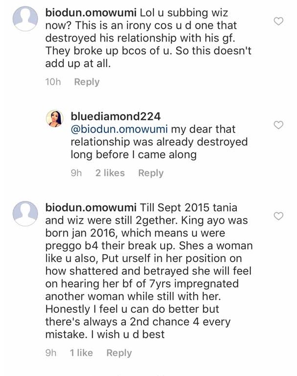 Omowumi who says he knows a lot about Wiz, said: “Till September 2015, Tania and Wizkid were still together. King Ayo was born January 2016, which means you were pregnant before their break up. She’s a woman like you also, Put yourself in her position on how shattered and betrayed she will fell on hearing her boyfriend of 7 years impregnated another woman, while still with her. Honestly I feel you can do better but there’s always a second chance for every mistake. I wish you the best”.