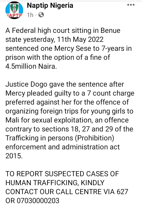 A 24-year-old woman, identified as Mercy Sese, has been sentenced to 7 years imprisonment by a Federal High Court sitting in Makurdi, Benue State, for sex trafficking.