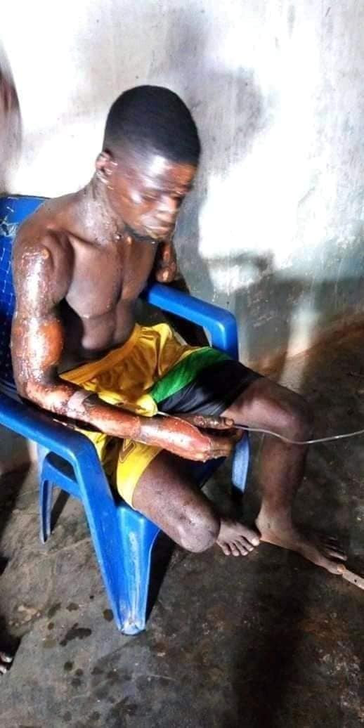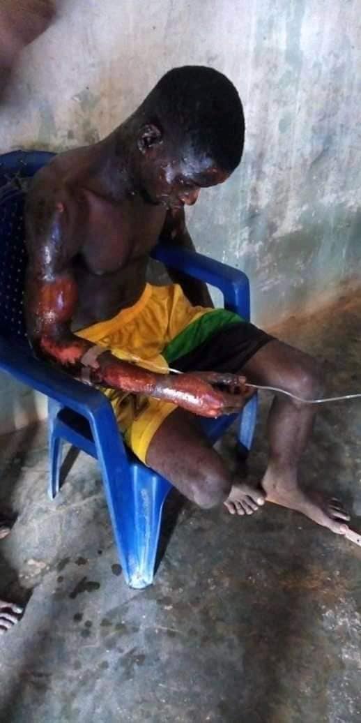 A concerned citizen identified as Shom Akor Fanen took to Facebook to share photos of the injured man and confirmed that he is currently receiving treatment, although his condition is terrible.