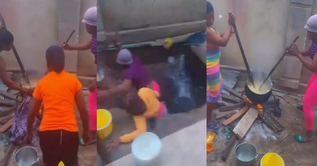 The video, which quickly gained traction online, shows the women cooking over an open fire on a visibly cracked concrete cover of a soakaway (septic tank).