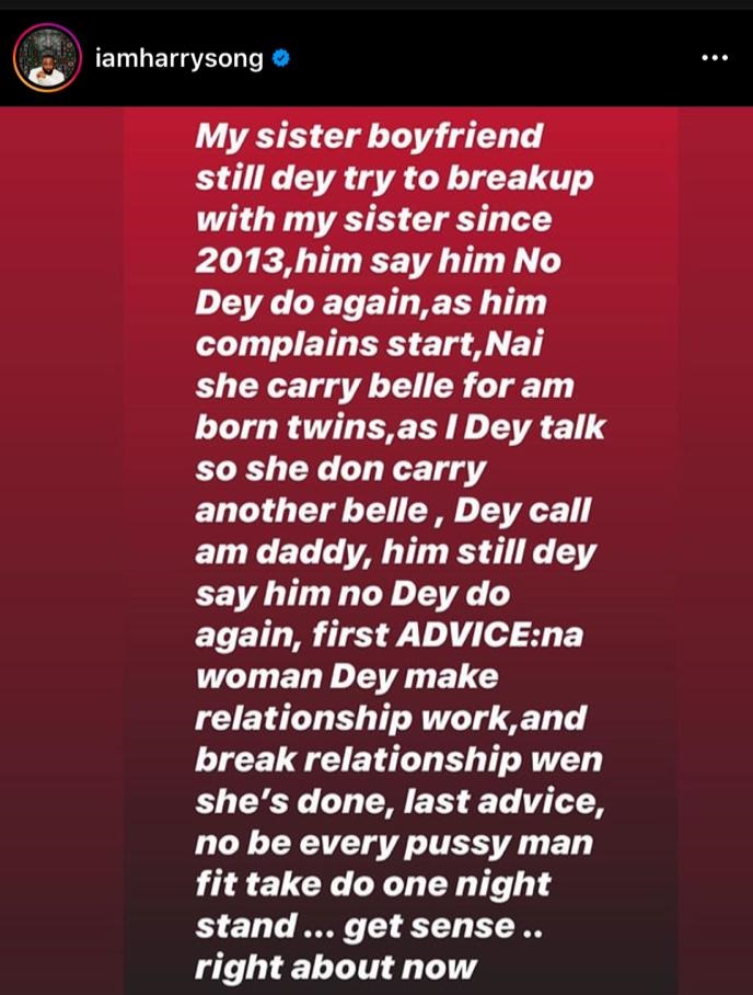 In his words,“My sisters boyfriend still dey try breakup with my sister since 2013, him say he no dey do again, as him complains start, Nai she carry belle for am born twins, as I dey talk so she don carry another belle , dey call am daddy, him still dey talk say him no dey do again, first advice, Na woman dey make relationship work, and break relationship when she’s done, last advice no be every pussy man fit take one night sense…get sense..right about now”.