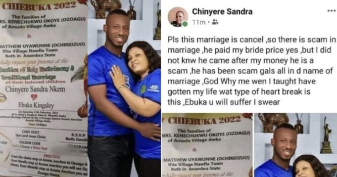 The lady, identified as Chinyere Sandra ended her marriage to Ebuka Kingsley only a few days after their wedding. Sharing the reason for her decision, she revealed that the man is a “scam” who only married her for her money.
