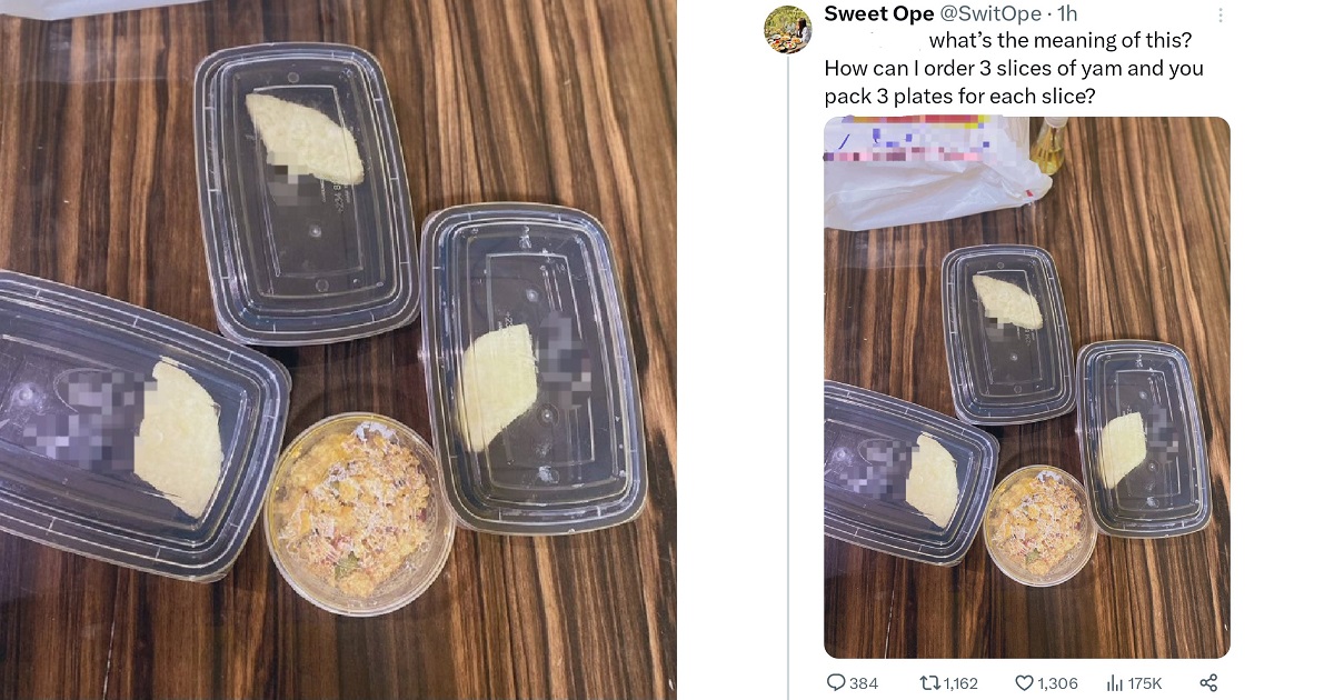 An unhappy customer recently took to social media to share her disappointment after a restaurant served her order of three pieces of yam in separate takeaway packs.