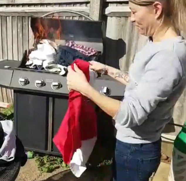 To get back at him, she filmed herself placing ‘pretty much‘ all of his clothes – £1,000 worth of items, such as designer jeans and shirts and three Arsenal FC tops – on a grill in a back garden and burning them 24 hours later.