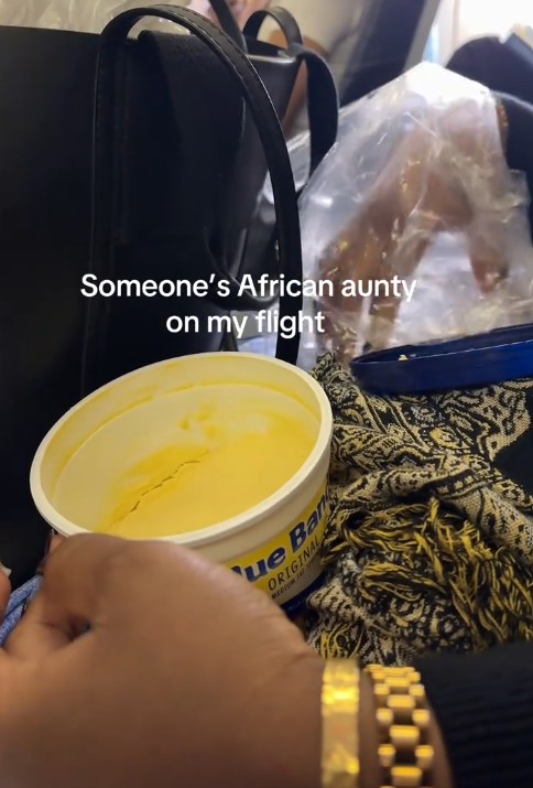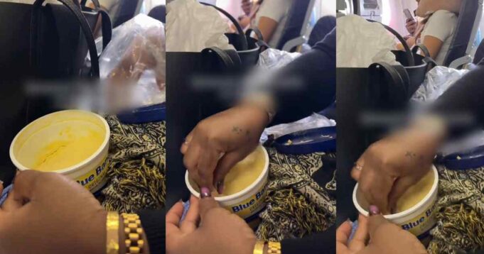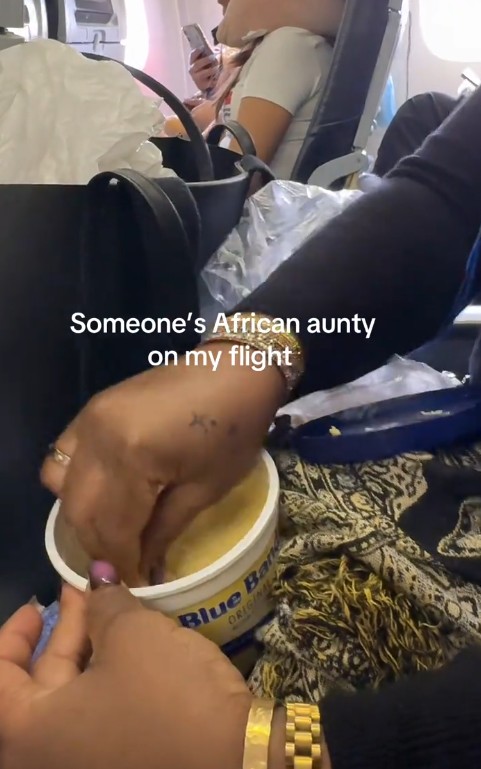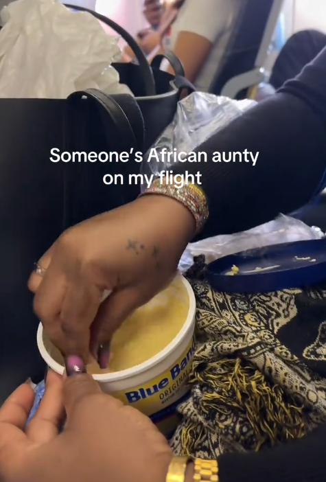 A woman couldn’t hide her surprise after noticing a familiar yet amusing scene during her flight, an African aunty casually enjoying her own meal of bread and butter onboard.