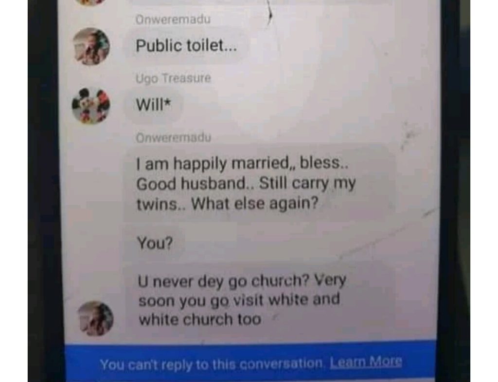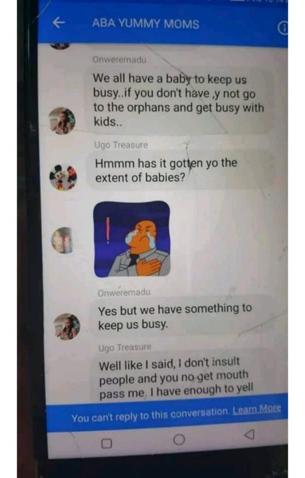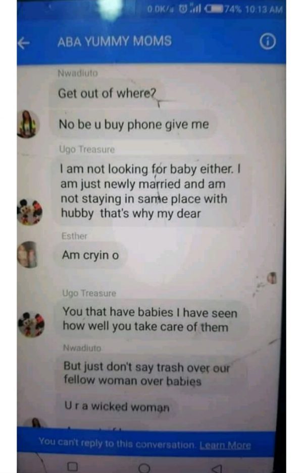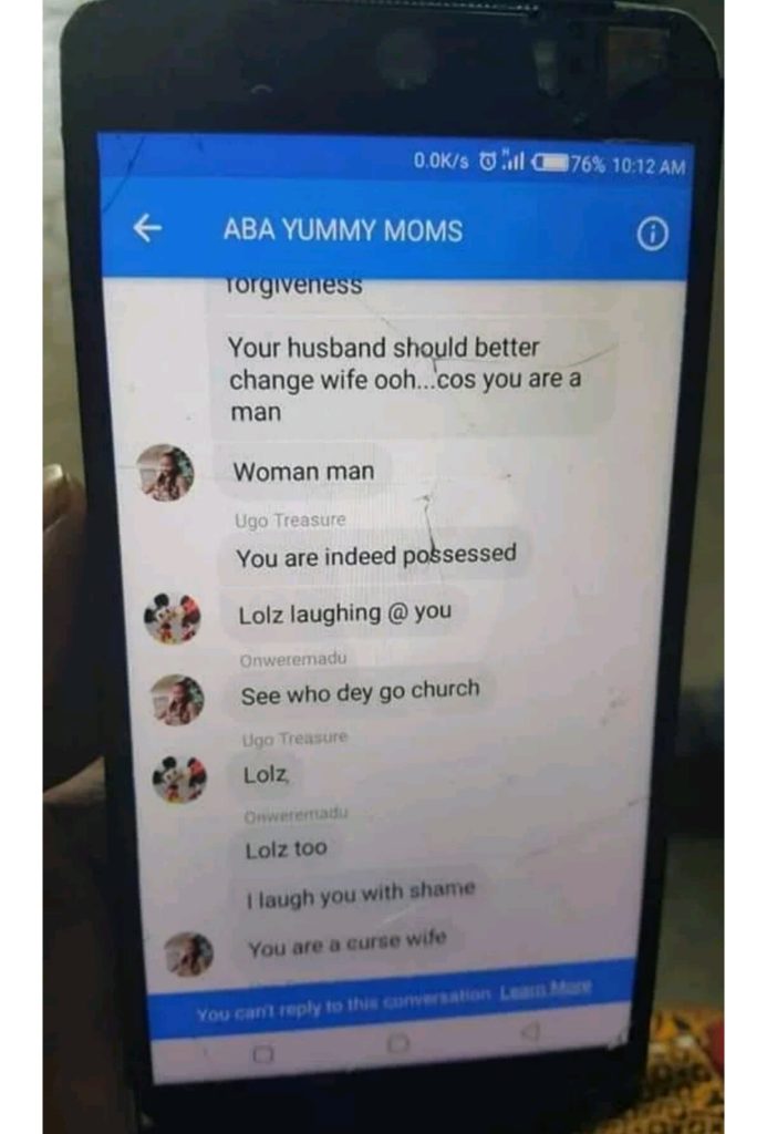 Ugo treasure was insulted by her fellow woman on this Facebook by name #Onweremadu_Jane who now changed her name to #Okoroafor_jane, onweremadu called her a woman man , barren, witch, a cursed wife etc , even told her that soon , her husband will marry another wife, she insulted her all because she havnt given birth yet.Onweremadu Jane is a CEO in a women’s group on Facebook, she prays for TTC mother’s ( women looking for a child), she pretend to be praying for this women yet use their childlesness to insult them at any given opportunity. How can a woman who pray for others use their childlessness to insult them?