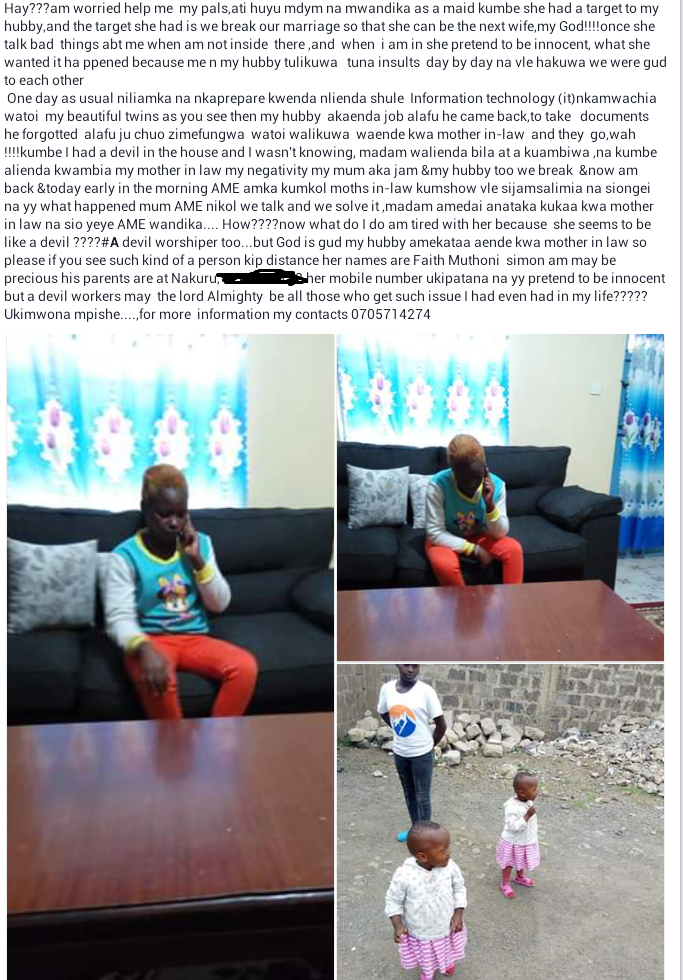 A Kenyan lady has taken to Facebook to share photos of her former housemaid as she apprises other women not to employ her cause she is a home wrecker and a devil worshipper.