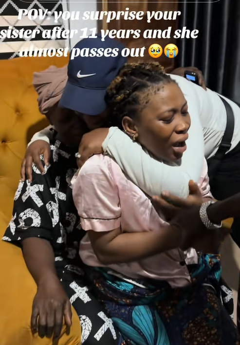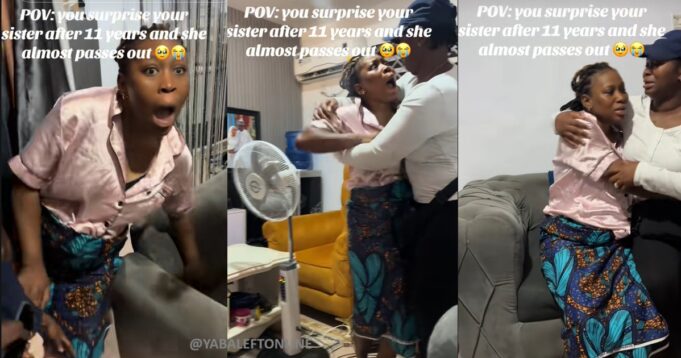 An overseas lady has shared an emotional video of how the sister she hasn’t seen in 11 years almost passed out following her surprise visit.
