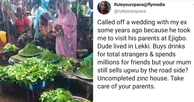 A Nigerian lady on Twitter took to the social networking platform to recount how she dumped her boyfriend because while he lives in Lekki, his mother sells vegetables in Ejigbo market.