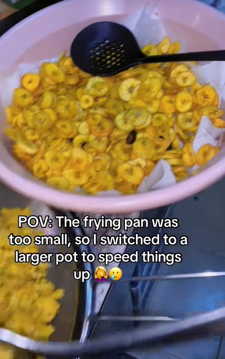 According to the lady, she was using a frying pan, but it was too small for a large quantity of plantain chips, and it would consume a lot of time.