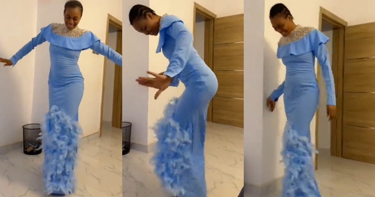 In the short video, the woman is seen twirling dramatically in the living room, dressed in a fitted maxi cape gown adorned with stylish feathers flowing behind her.