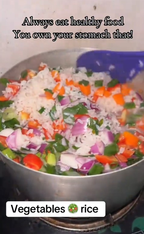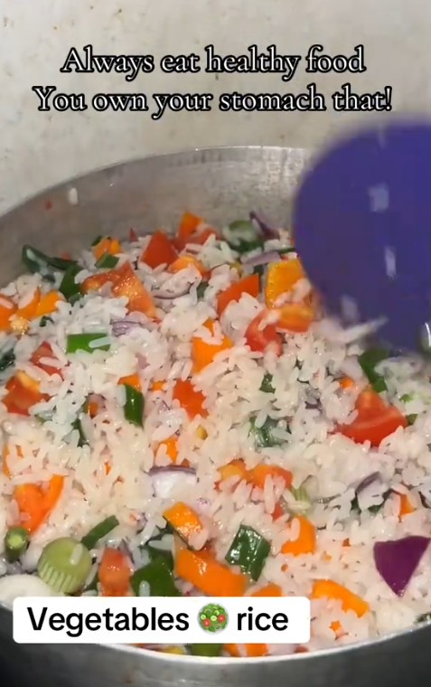 As shown in the video, the woman advised people to eat healthy food, implying that her rice was healthy since it had vegetables sliced in it. She exclaimed that people owe their stomach a healthy meal; hence, they should embrace it.