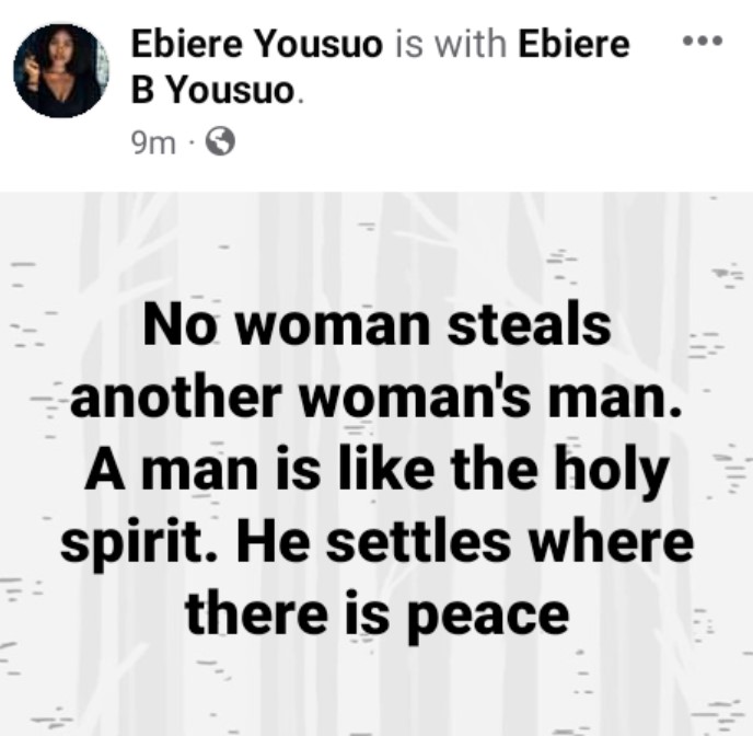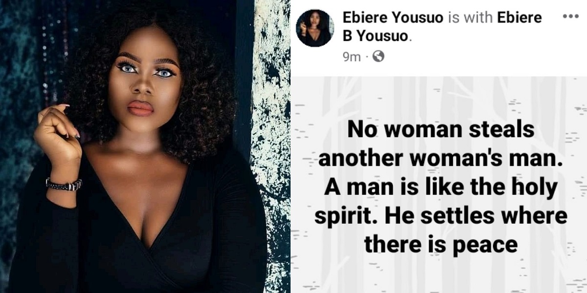 In a post she shared on Facebook, Ebiere asserted that women don’t snatch another woman’s man, rather men go for the women who gives him peace.