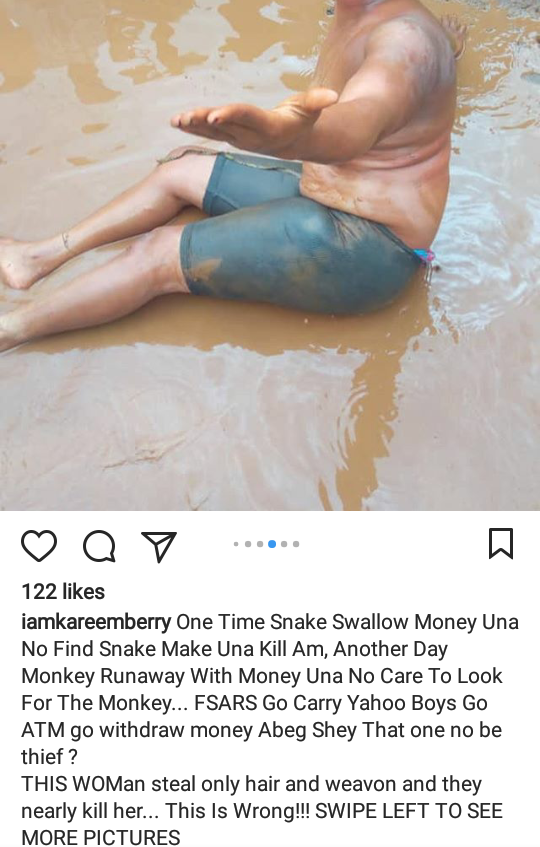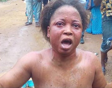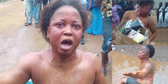 An enraged social media user shared photos of a woman who was on mercilessly stripped unclad and paraded after she was caught stealing artificial hair, Weavons.