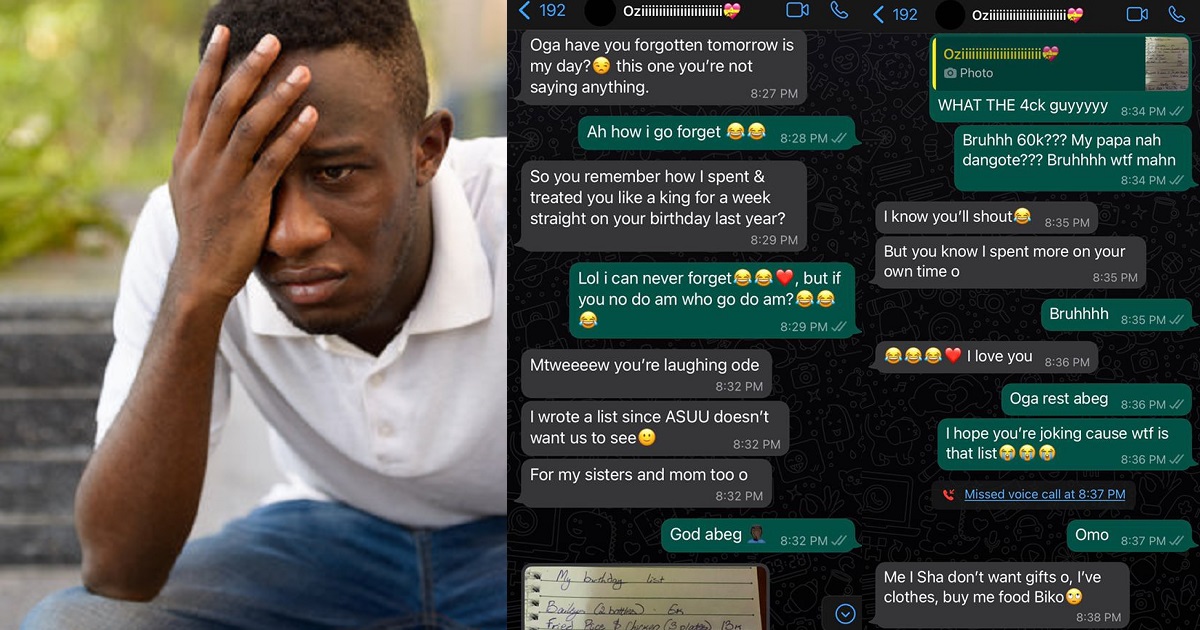 A young man has taken to Twitter to lament bitterly after his girlfriend sent him a comprehensive list of things she wants for her birthday.