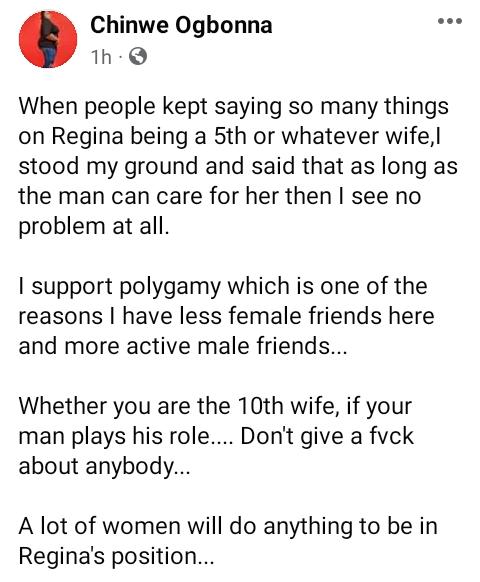 In a recent Facebook post, a Nigerian woman Chinwe Ogbonna expressed her support for polygamy, emphasizing the significance of men’s ability to provide for multiple wives.