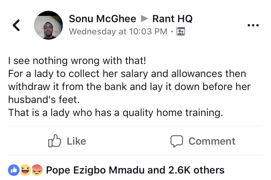 Okafor Kenechukwu Blessing: Hmm! Ladies calm down oo. I read this comment severally b4 I am actually writing this. Most of us do this every month but yet we are here ranting just bc of the word dis guy used ” lay it at his feet”. But in the rare sense of it that’s what it sld be. When u indeed marry ur husband that’s the right thing to do. When u receive ur salary wether daily,weekly or monthly u table it b4 ur man and u two make plans togeda. As long as ur doing that he will unconsciously do same. U both plan what to do with d money and u both have a pocket money from there for all personal or family needs including ur extended family if need be. Marriage is sweet oo if we cld follow it biblically. But d world has become so evil and selfish,self centered that what this man wrote sounds gibberish. But sorry if ur hubby is an irresponsible drunkard sorry is ur name. Let’s think about it. In d real sense of husband and wife without ulterior motives u both sld know exactly what u both earn and make plans on that and yes the only way that can be done effectively is by laying ur salary or wage at his feetooo,table oo or we’re ever u choose. Wn money finish na him so dey provide till d next pay. No brain racking for u. No bi small thing oo. Oya ooo make una attack me now. 1 love