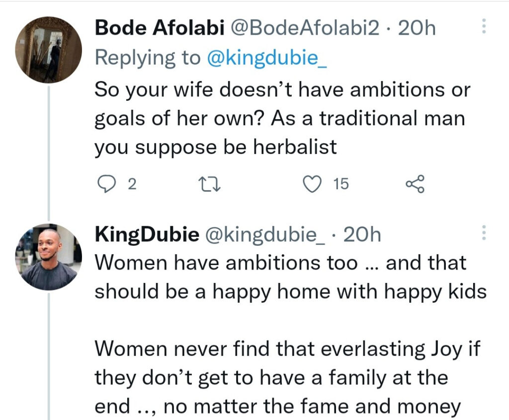 Taking to Twitter, @kingdubie_ said the utmost goal of a woman should be to have a happy home with happy kids.