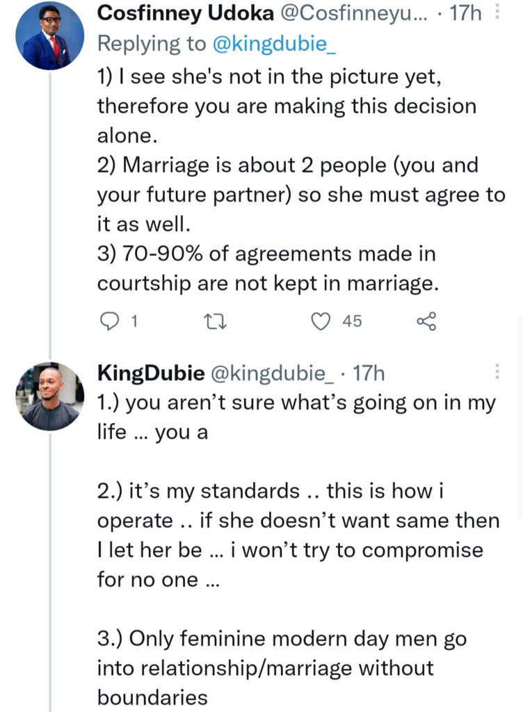 According to the Twitter user who called himself a traditional man, he already has an investment plan in place to provide everything his family would need to survive without his wife pitching in.