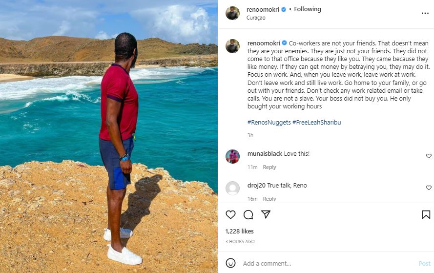 Taking to his Instagram page, Reno asserted that one’s co-workers are not your friend and should not be regarded as friends.