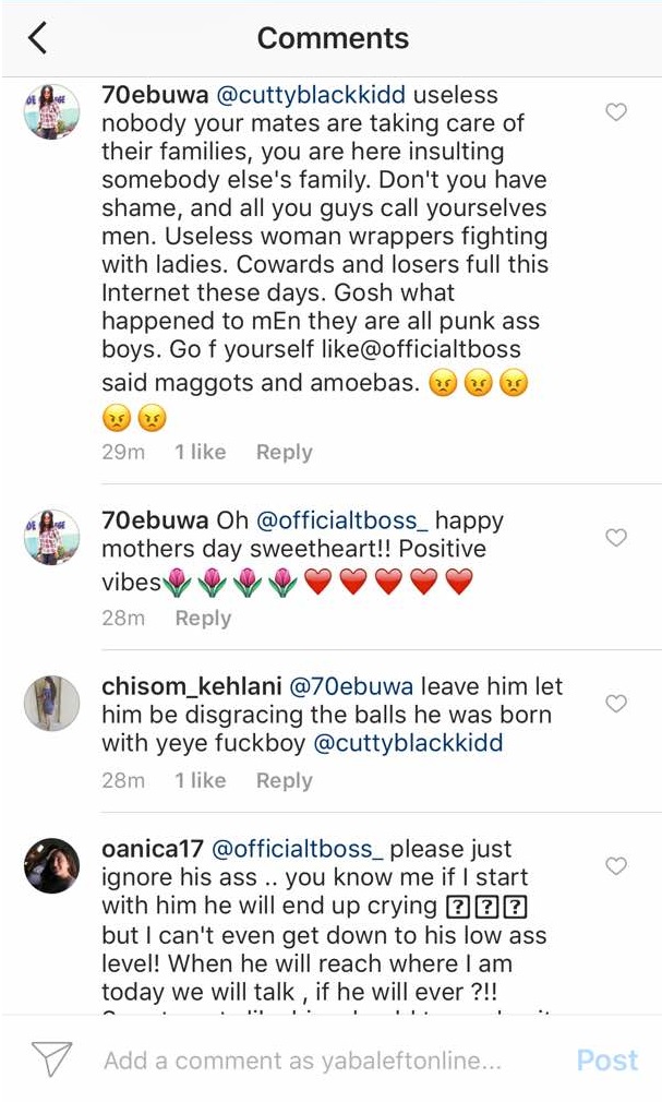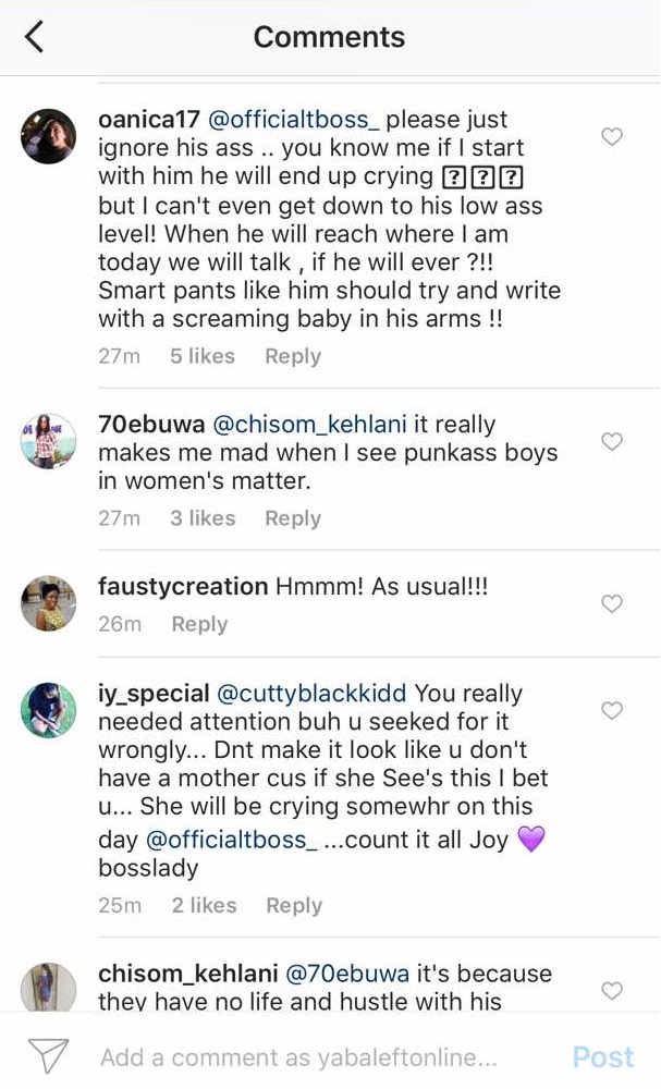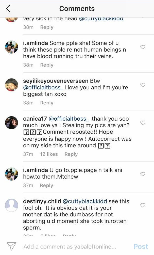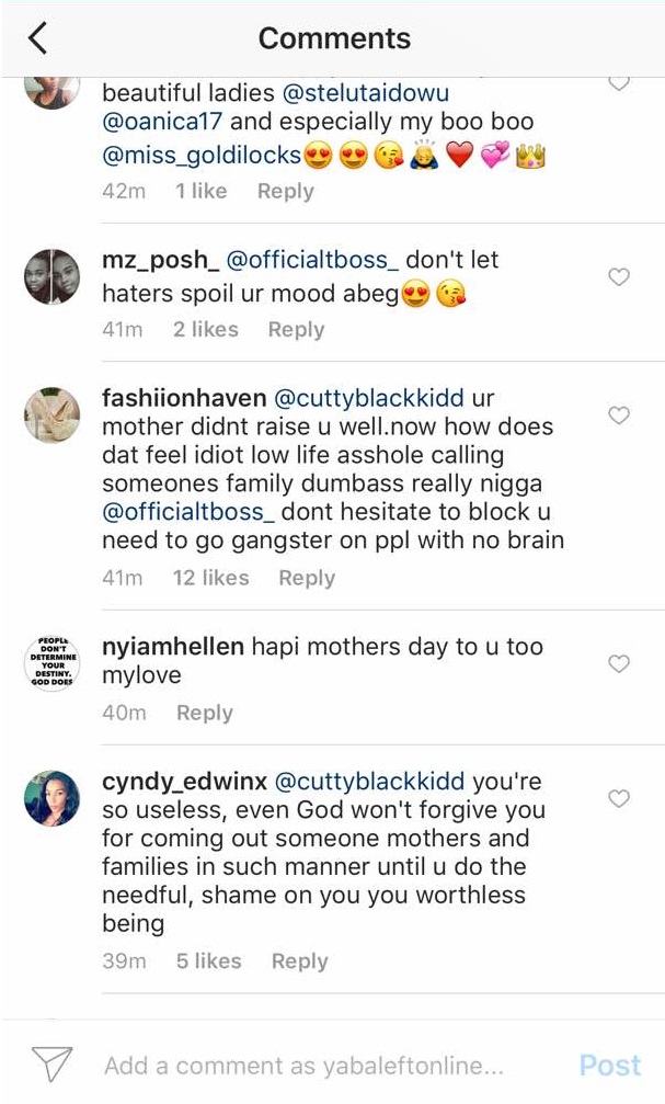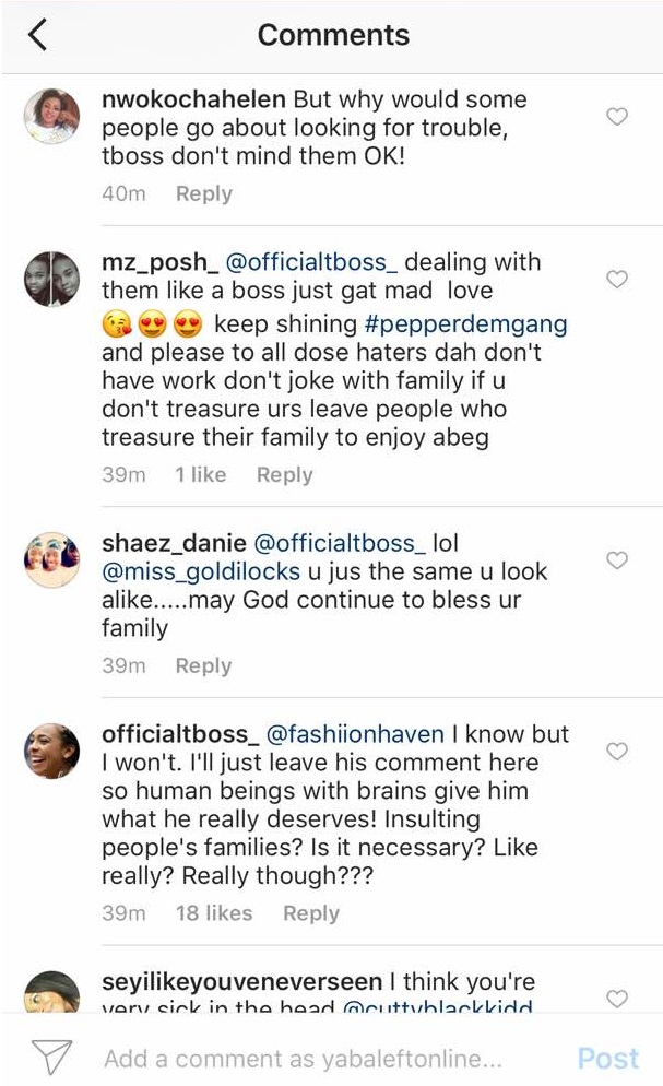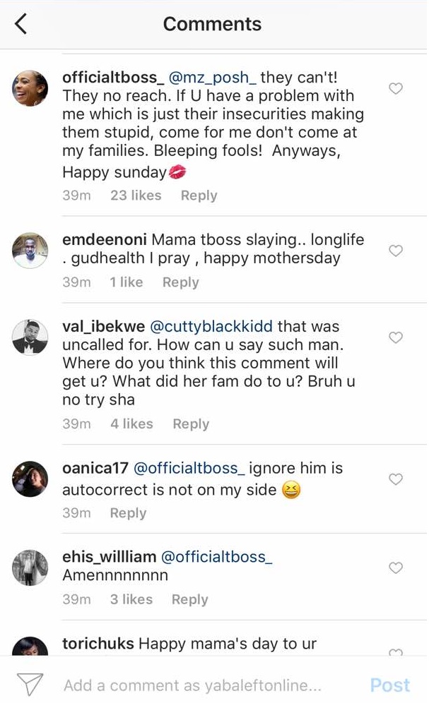Apparently, one of the women TBoss Tagged responded, her aunty, made a typographical error as she responded to TBoss Mothers’ Day Message, she wrote: “stilling” instead of “stealing”.. Then a troll felt the need to curse out Tboss’ aunty.