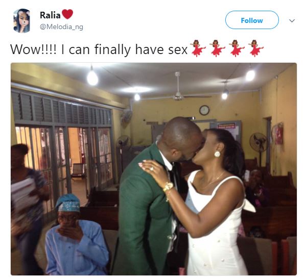 She took to her page to share a photo from their court wedding, where she was kissing her husband. She simply wrote: “I can finally have sex.. with several dance smiley”.
