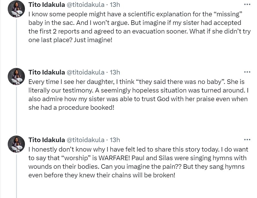 A Nigerian writer who identifies as @titoidakula has shared how her sister delivered a baby girl after two hospitals claimed that there was no baby in her womb.