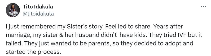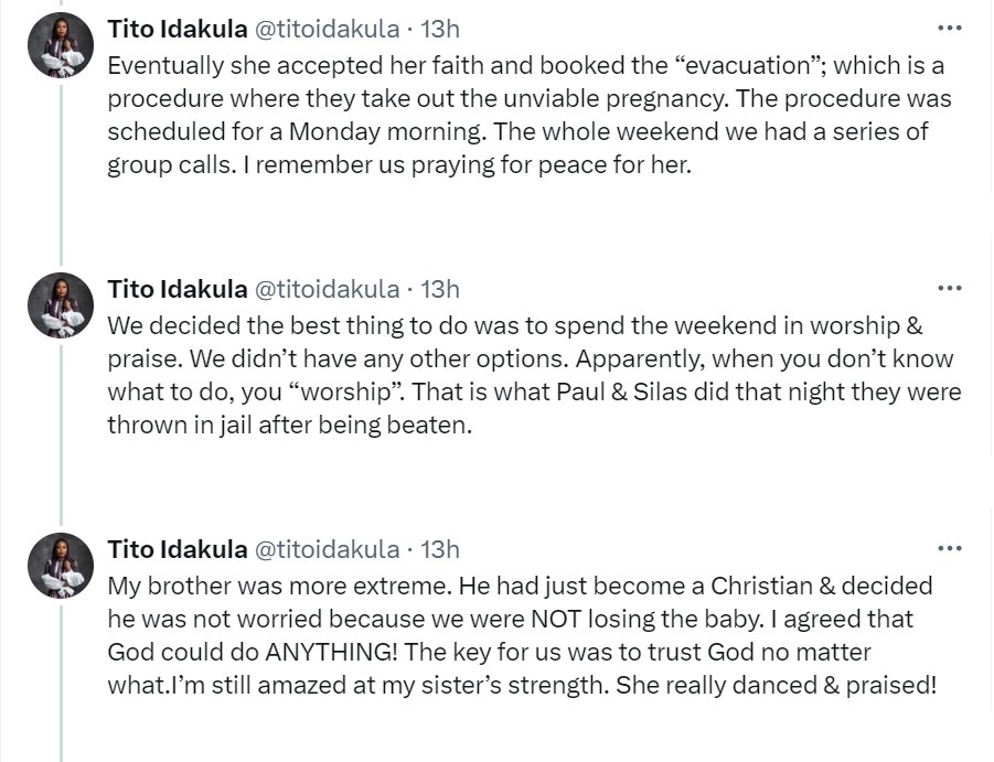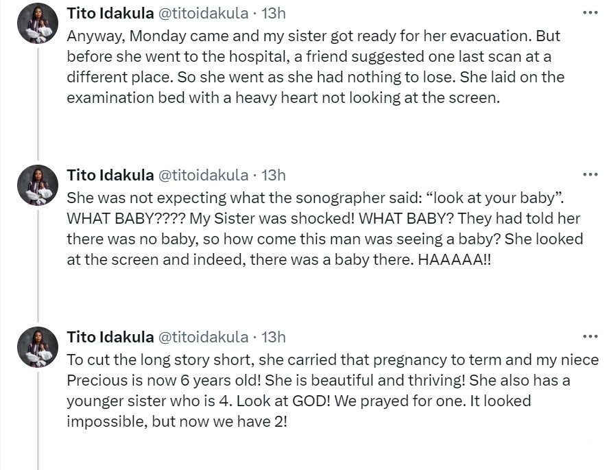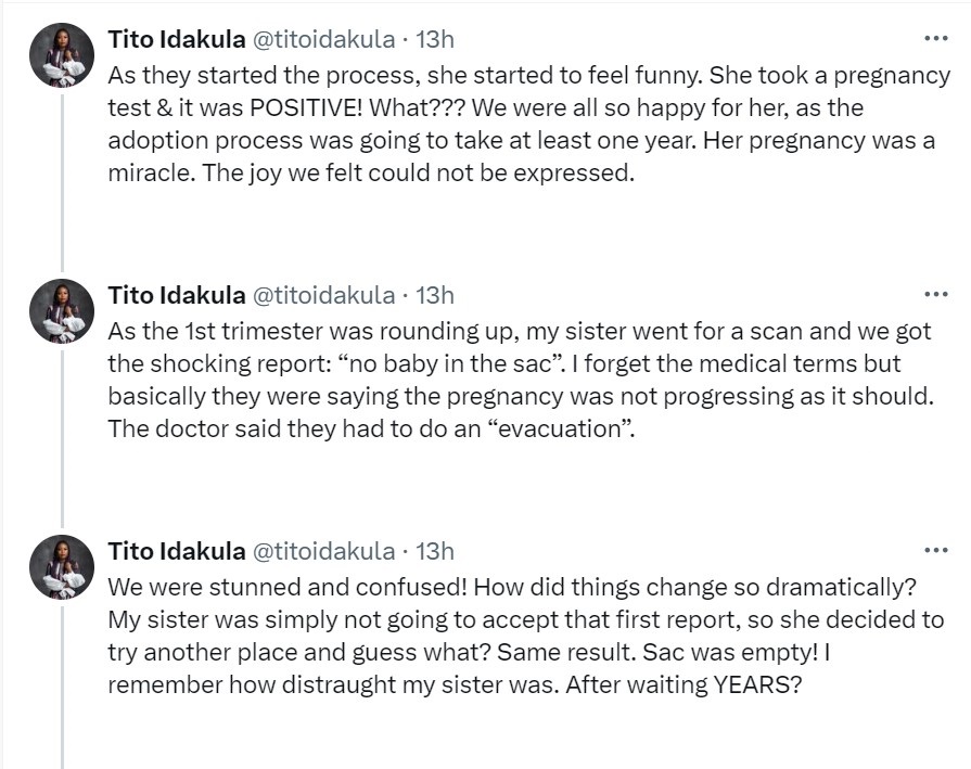 A Nigerian writer who identifies as @titoidakula has shared how her sister delivered a baby girl after two hospitals claimed that there was no baby in her womb.