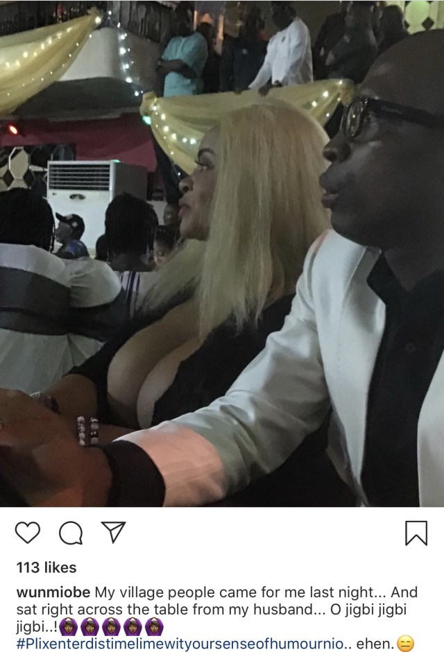 Classic Nigerian Singer, Wunmi Obe recanted hilariously after actress, Cossy Ojiakor and her exposed boobs sat opposite her husband at an event recently.