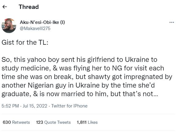 A Twitter user, @Makavelli275, who shared the story on the micro-blogging platform, said the Yahoo Boy sent his lover to study medicine in Ukraine and covered all her expenses.