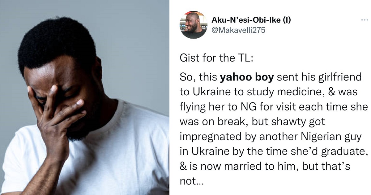 So, this yahoo boy sent his girlfriend to Ukraine to study medicine, & was flying her to NG for visit each time she was on break, but shawty got impregnated by another Nigerian guy in Ukraine by the time she’d graduate, & is now married to him, but that’s not…