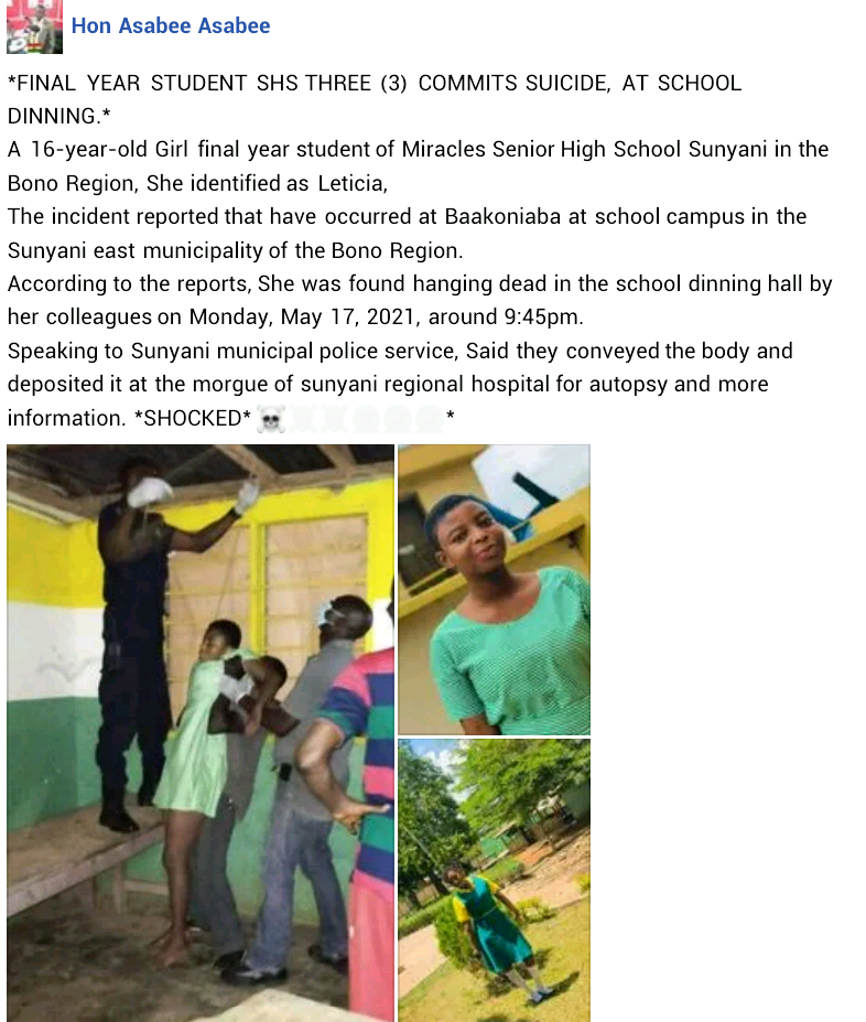 Popular journalist with Sunyani 88.1 FM, Hon. Asabee Asabee, who shared the tragic incident on Facebook noted that the deceased is a final year student Miracle Senior High School, located at Baakoniaba, Sunyani east municipality.