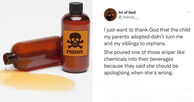 “I just want to thank God that the child my parents adopted didn’t turn me and my siblings to orphans. She poured one of those sniper like chemicals into their beverages because they said she should be apologising when she’s wrong.