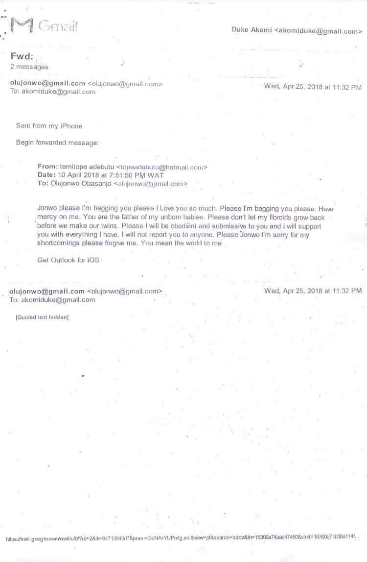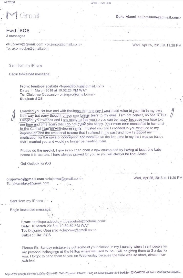 According to some documents, trouble started few days after their wedding in May, 2017, when Olujonwo noticed that Temitope was acting strange.