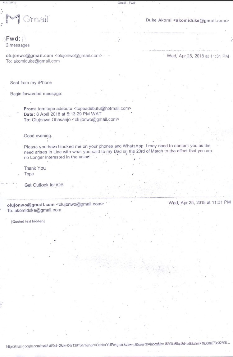 The one-year-old marriage between Olujonwo, son of former President Olusegun Obasanjo, and Temitope, daughter of Lotto boss, Chief Kessington Adebutu aka Baba Ijebu, is currently in crisis as the husband has dragged the wife to court over threat to his life.