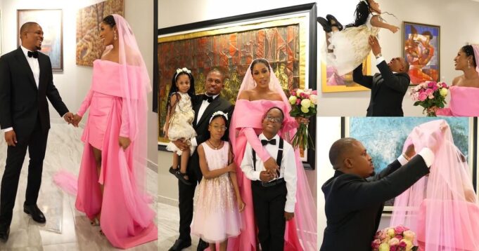 In marking 10 years of marital bliss, the couple shared an adorable wedding-themed video with their children on their respective social media pages.