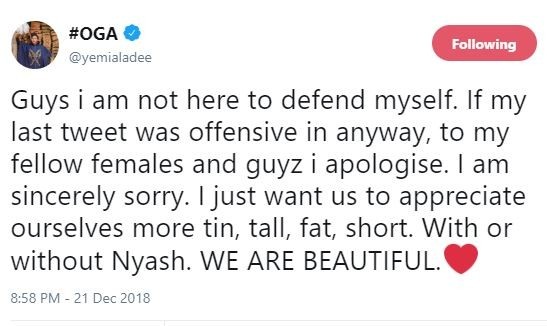 ‘guys I am not here to defend myself. If my last tweet was offensive in anyway, to my fellow females and guyz i apologise. I am sincerely sorry. I just want us to appreciate ourselves more tin, tall, fat, short. With or without Nyash, WE ARE BEAUTIFUL’.