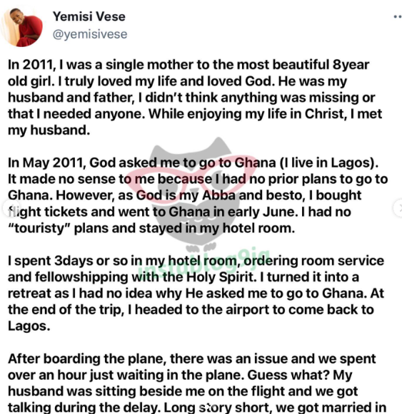 According to the woman, she was divinely led to visit Ghana from Lagos without having a purpose and on her way back she met her would be husband, they got talking and barely 7 months later, they got married.