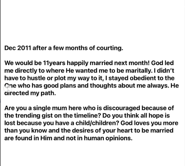 We would be 11years happily married next month! God led me directly to where He wanted me to be maritally. I didn’t have to hustle or plot my way to it, I stayed obedient to the One who has good plans and thoughts about me always. He directed my path.