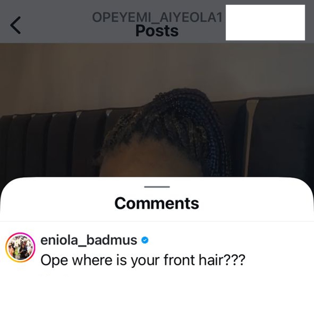 Eniola Badmus had commented, ‘Opeyemi, where is your hair?‘ under one of her posts, which riled the actress up, especially since they are neither friends nor close.