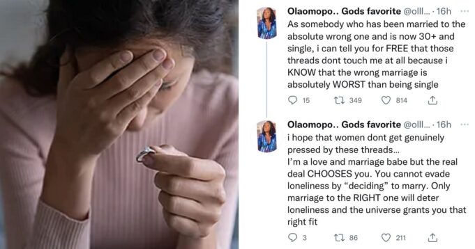 A woman who married early but is now divorced has advised women to not be swayed by a tweet advising them to get married to avoid becoming old and single.