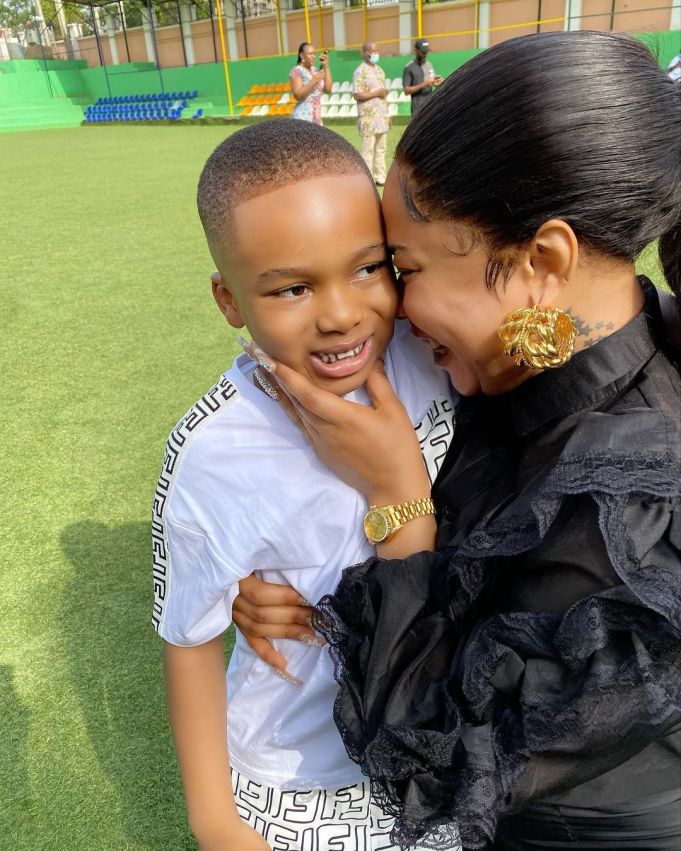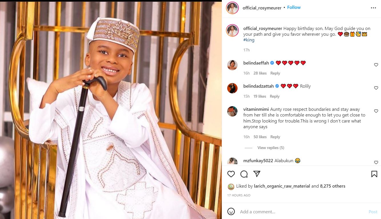 Nollywood actress, Rosy Meurer, has come under fire for posting her husband’s son with his estranged wife, Tonto Dikeh, King, on social media on his birthday.