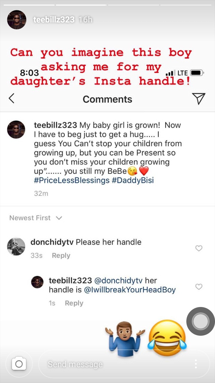 After sharing the photo, Tee Billz had an exchange with a follower who he threatened to break his head after the follower turned up in the comment section of his pic to ask for his daughter’s handle.
